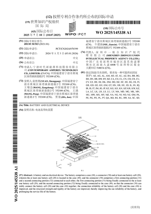 本站消息,根据企查查数据显示宁德时代(300750)公布了一项国际专利申请,专利名为“电池及用电装置”,专利申请号为PCT/CN2024/070399,国际公布日为2025年7月10日。